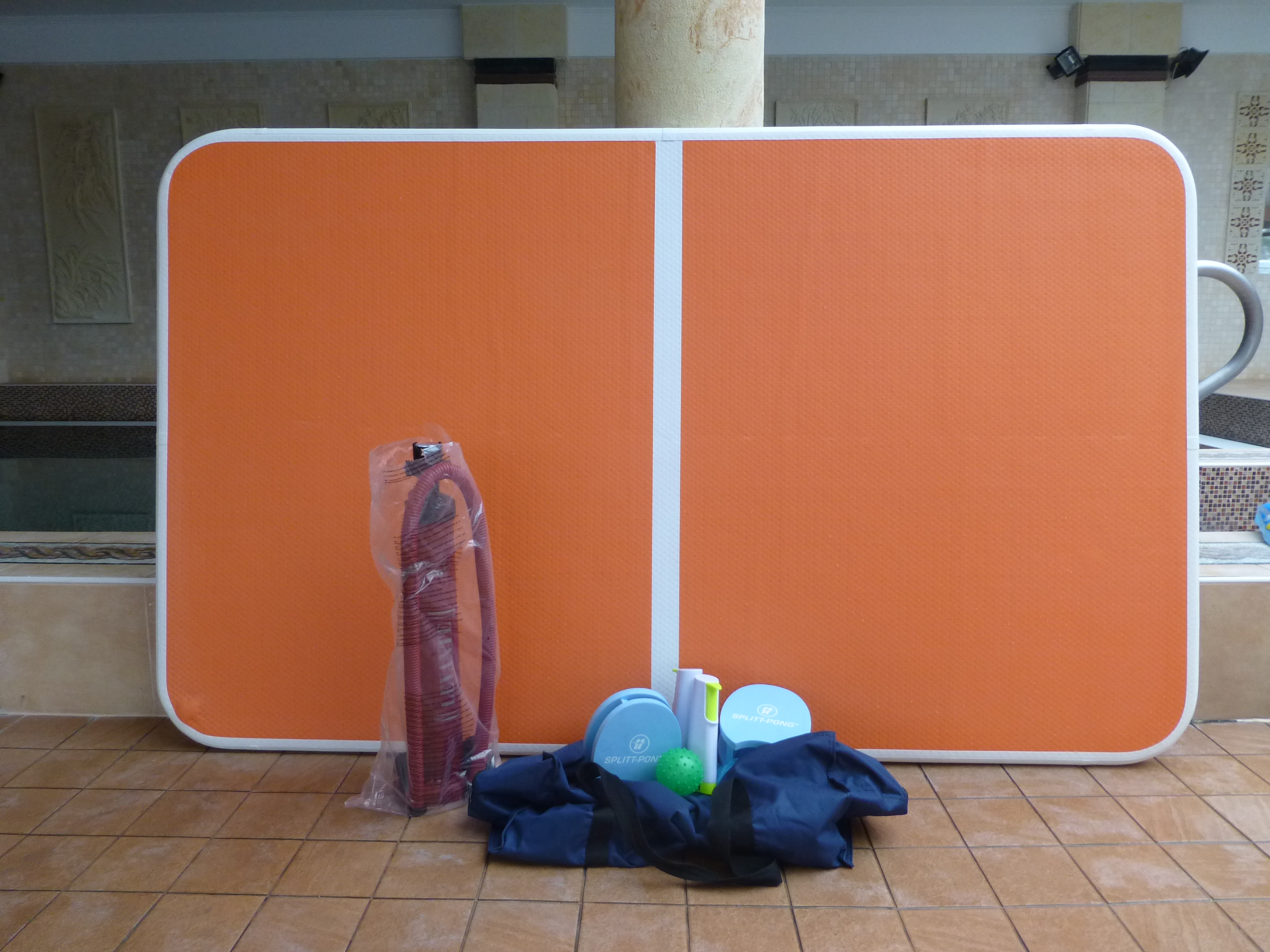 A legmodernebb termékünk a SplitT-Pong "VIP" felfújható asztallal rendelkező készlet. Az egész készlet elfér egy sporttáskában, amit magunkkal lehet vinni nyaraláskor akár a repülőgépre is. A SplitT-Pong "VIP" készlet részei: 1 db 200cmX120cm méretű felfújható asztal, javító kit asztalhoz, pumpa, háló, 2db kesztyűütő, 4 db labda, 70cm X 36cm X 32cm-es táska.  A készlet rendelési kódja SP-VIP.  Ára: 119.385,4 Ft + ÁFA = 151.620 Ft